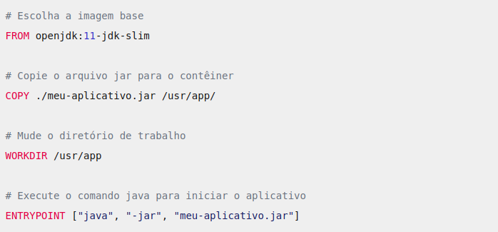 Este Dockerfile começa com a imagem base openjdk:11-jdk-slim, que é uma imagem Docker oficial do OpenJDK que inclui os seguintes ambientes Java na imagem padrão: o JRE (Java Runtime Environment) e o JDK (Java Development Kit).