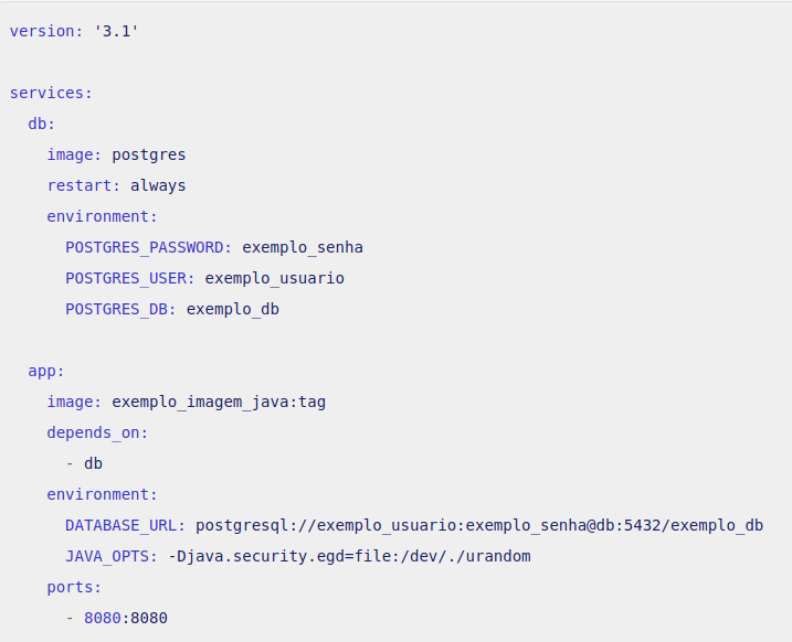 Neste exemplo, o serviço db é o banco de dados PostgreSQL e o serviço app é a aplicação Java. As variáveis de ambiente necessárias para a conexão com o banco de dados são definidas no serviço app.